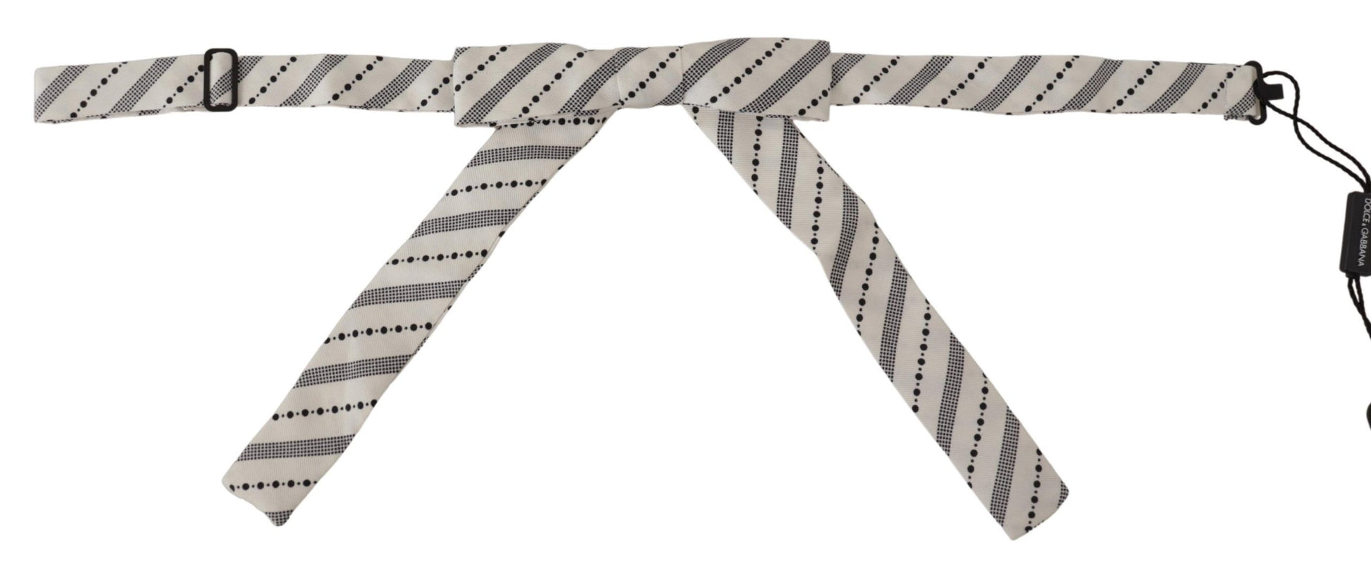 Adorn your ensemble with a touch of timeless elegance. This exquisite bow tie by Dolce & Gabbana features a charming white and black polka dot design that's perfect for sophisticated events. Crafted from luxurious 100% silk, it boasts a sumptuous feel and a pristine look. Designed and made in Italy, this tie speaks volumes of refined taste with an adjustable neck strap for an impeccable fit. It's an authentic piece new with tags, ready to enhance your formal attire.