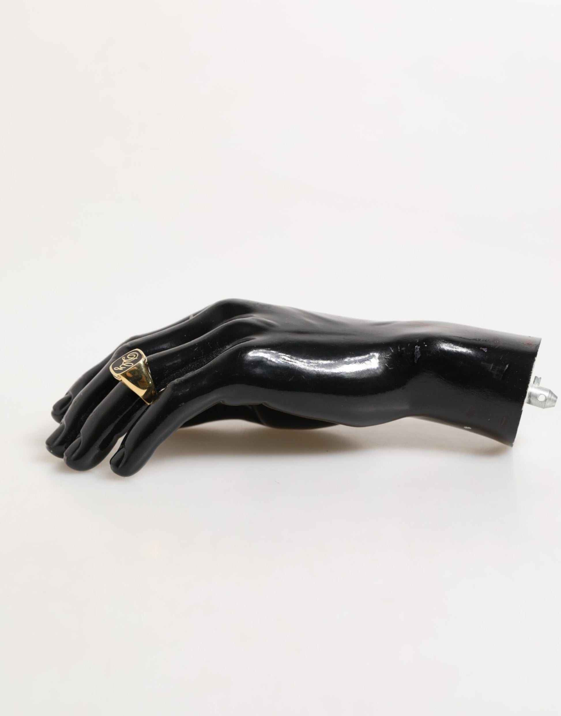 Gorgeous brand new, 100% Authentic Dolce & Gabbana signet ring, featuring an engraved DG script logo on a smooth black enamel face. Crafted in Italy from polished brass (ottone), this luxurious ring makes a strong fashion statement with its chunky silhouette and vintage-inspired signet style.